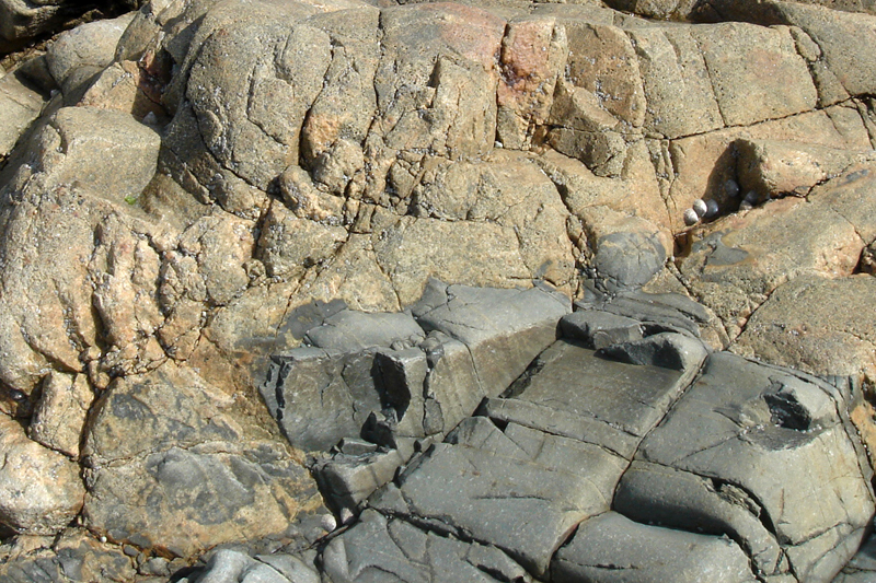 Lors de sa mise en place, le magma granitique s’est insinué entre les lits fracturés des cornéennes. |