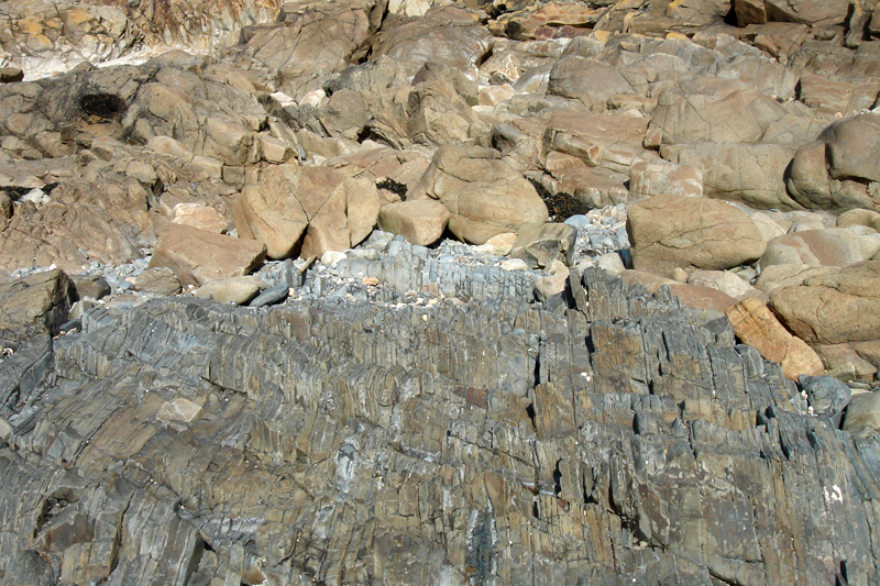 Les cornéennes litées et redressées à la verticale forment une plate-forme d’abrasion sur laquelle sont éparpillés quelques rochers granitiques aux formes arrondies. |