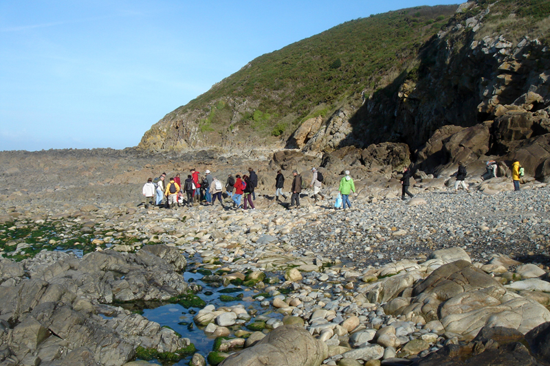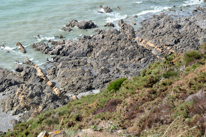 Les cornéennes affleurent plus bas sur l’estran ; elles sont entièrement recouvertes par la mer à marée haute.