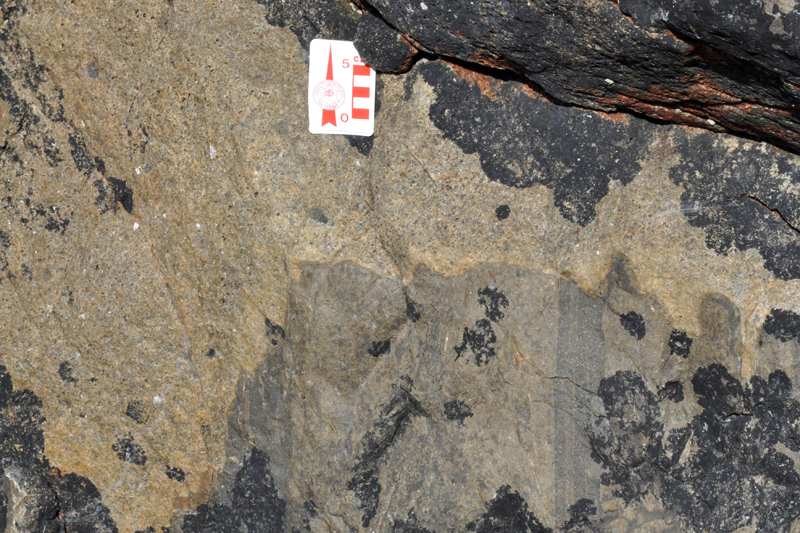 Le plus souvent, la granodiorite recoupe les cornéennes à l’emporte-pièce ; le contact est alors sinueux, parfois diffus. Localement, la granodiorite peut suivre les plans de stratification des cornéennes et le contact devient rectiligne.