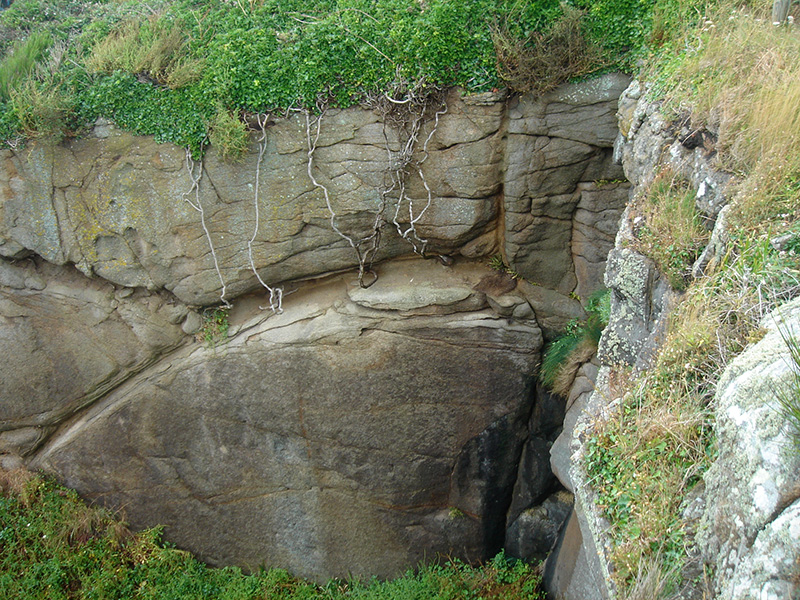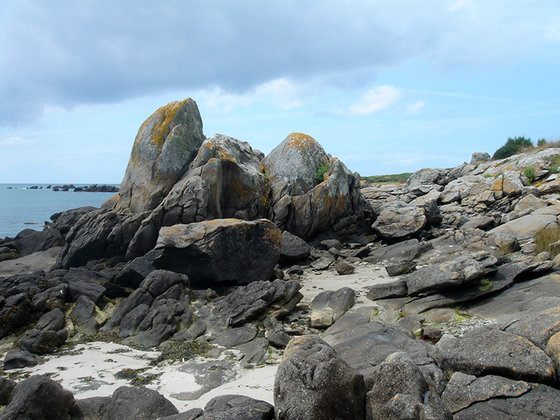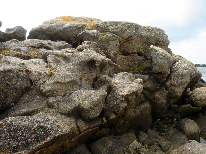 Sous la surface, là où il y a contact permanent avec l’eau d’infiltration, le granodiorite s’altère et se transforme progressivement en arène. Sur le littoral, la mer évacue l’arène granitique et met à nu le granodiorite qui se trouve alors directement exposée à l’érosion.