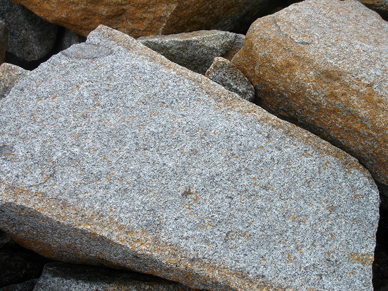 La surface de cassure de ce bloc présente une bordure de teinte un peu rouille caractéristique de l’altération de la granodiorite. L’altération a débuté à la périphérie au contact de l’eau présente dans les diaclases, quand le bloc était entier et en place ; elle a progressé vers l’intérieur du bloc sur quelques centimètres d’épaisseur. Le processus est maintenant stoppé car les bordures du bloc ne sont plus en contact permanent avec l’eau.