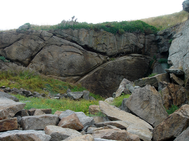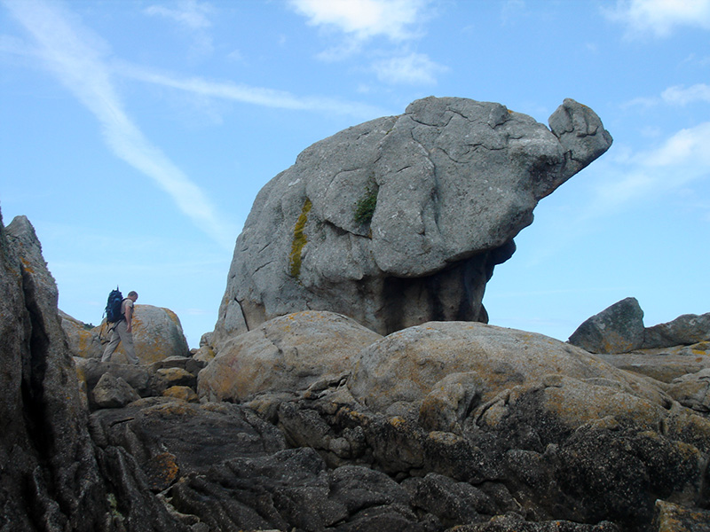 L’altération et l’érosion façonnent des rochers aux formes évocatrices. Ici on peut « voir », sous un certain angle, un éléphant avec sa trompe relevée. Cette masse de granodiorite, qui a résisté à l’altération, a été dégagée par l’érosion littorale. Un autre angle de vue permet de constater qu’elle est parcourue de larges diaclases verticales.