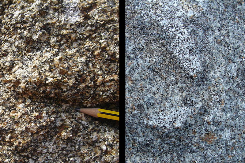 Granodiorite saine (à droite) : la surface est presque lisse, sans cristaux proéminents, et de couleur gris bleuté. Les cristaux sont fortement engrenés les uns dans les autres.