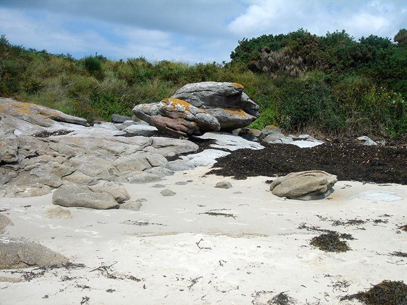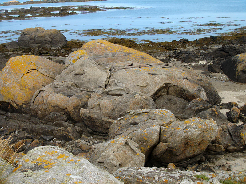 Rochers granodioritiques en équilibre isolés sur le platier rocheux