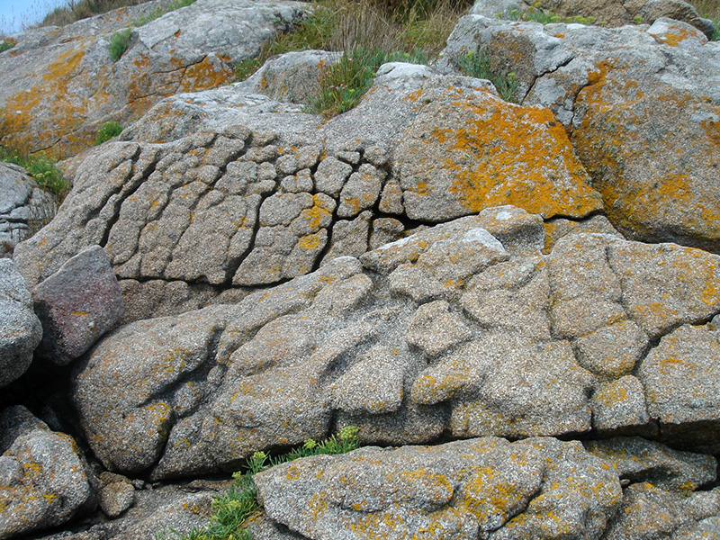 La granodiorite est une roche massive très cohérente, mais elle est fracturée par de nombreuses diaclases qui représentent autant de voies de circulation pour l’eau d’infiltration responsable de son altération.