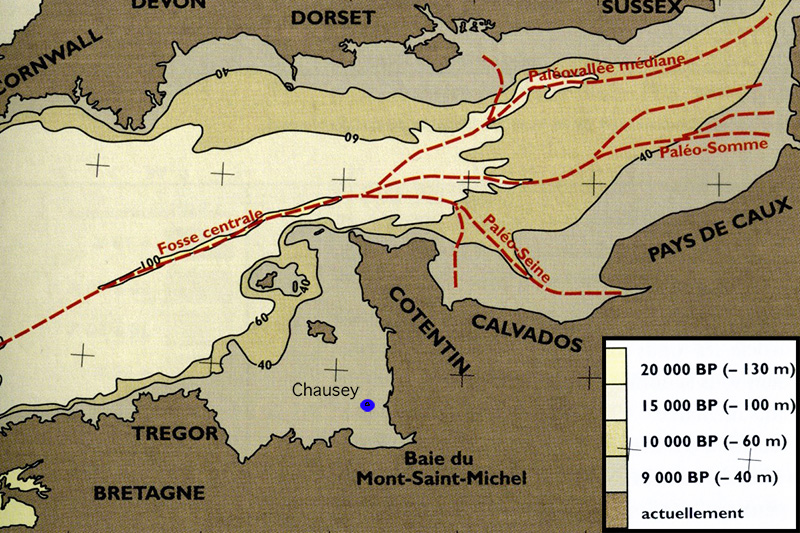 Il y a 10 000 ans, à la fin de la dernière glaciation, les îles Chausey étaient encore accessibles à pied sec. En effet, le niveau de la mer était beaucoup plus bas qu’actuellement (- 40m), après avoir atteint un minimum de -130 m vers - 20 000 ans.