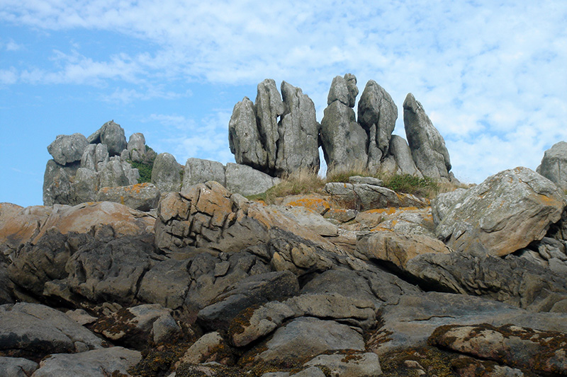 L’érosion façonne les caps et promontoires. Les rochers granitiques dégagés de leur arène sont exposés à l’action des vagues, du vent et des embruns.