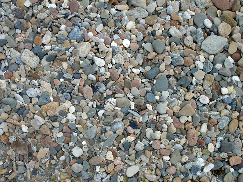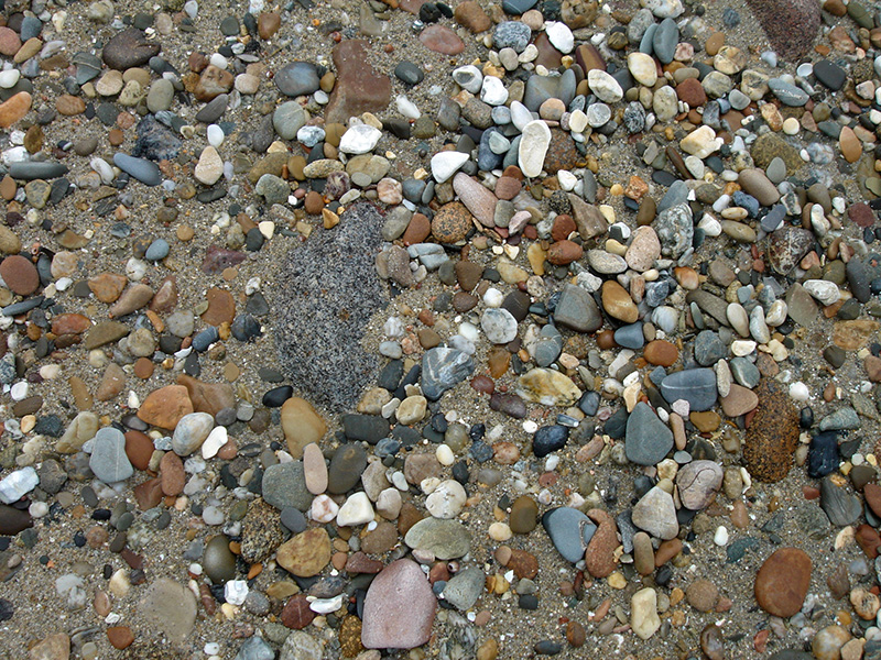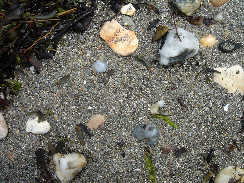 Des graviers et des galets très variés recouvrent le substratum granodioritique gris bleu dans la partie basse des plages.