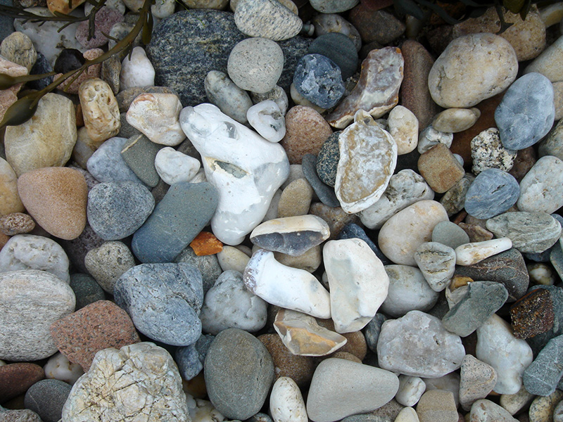 Parmi les petits galets de la plage, on trouve des fragments de silex usés à cassure noire et cortex blanc. Ces silex proviennent probablement de la Craie, formation sédimentaire crétacée, présente sur le fond de la Manche centrale et exondée lors des glaciations. |