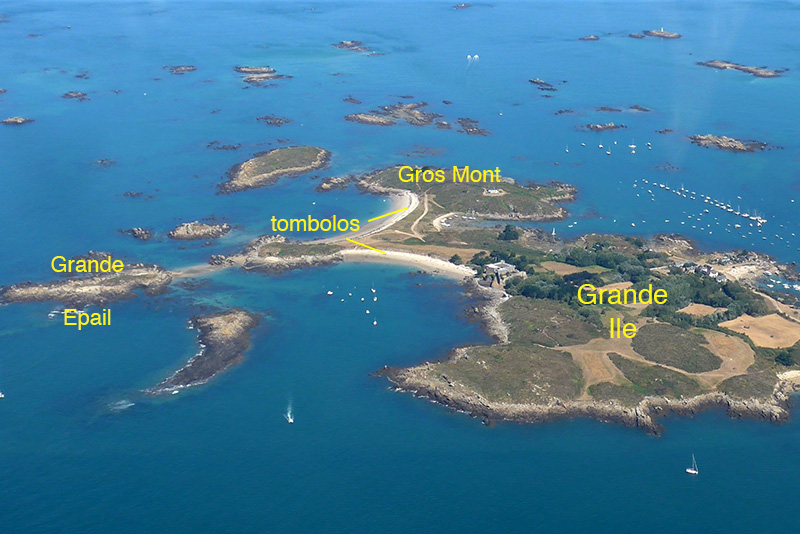 La partie nord-ouest de la Grande-Ile est constituée par deux îlots granitiques reliés au corps principal de l’île par deux tombolos. Chaque tombolo est un cordon sableux qui s’est formé par accumulation du sable dans la zone abritée située entre l’îlot et l’île, là où se rencontrent les vagues résultant de la diffraction de la houle par l’îlot.
