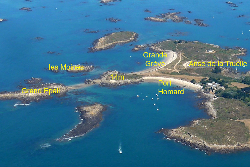 Le deuxième tombolo rejoint l’îlot coté 14 m et se prolonge en direction du château par la longue plage de Port-Homard. Une ébauche de cordon sableux relie l’îlot coté 14 m à l’îlot de Grand Epail.