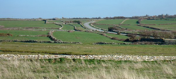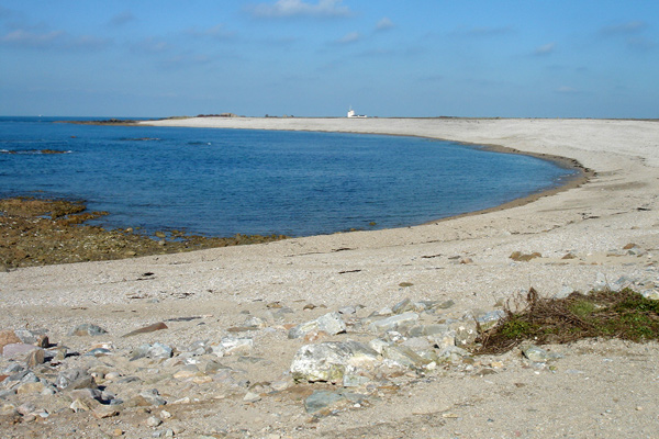Sédimentation littorale actuelle Au nord de Goury, le long du GR223 menant au sémaphore de la Hague, un épais cordon littoral de galets recouvre le granite du platier rocheux encore visible dans sa partie basse (à gauche) et à l’extrémité de la pointe rocheuse qui ferme l’anse. Délimitée par deux pointes rocheuses, l’anse constitue une zone abritée favorable à l’accumulation de matériel sédimentaire (ici, des galets). |