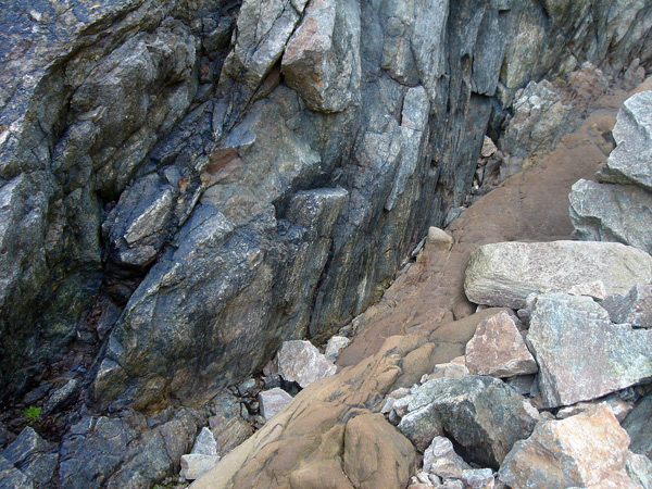 Un filon de minette (en partie recouvert de blocs de gneiss) reconnaissable à sa couleur brune affleure en creux : il a été profondément érodé alors que les paragneiss encaissants (gris bleuté) ont beaucoup mieux résisté. |