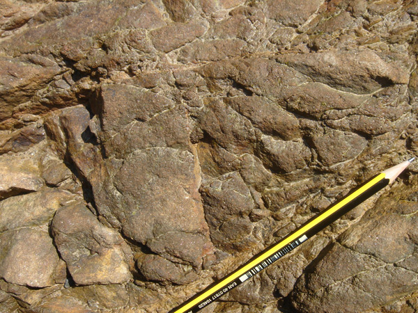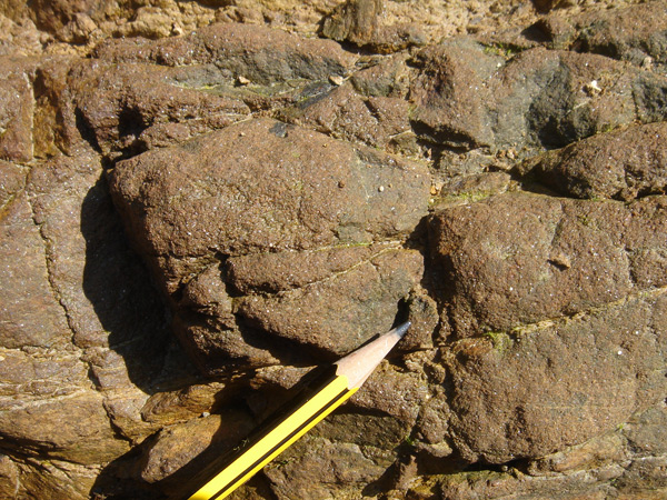 La surface d’affleurement présente des formes arrondies caractéristiques.