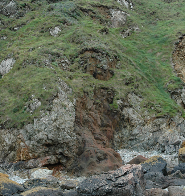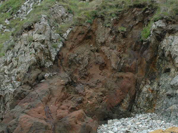 En suivant le couloir d’érosion jusqu’à la falaise, on retrouve la minette (brune) en place dans la falaise, encadrée par les paragneiss (un peu bleutés) et surmontée par un head (dépôt de solifluxion d’âge quaternaire) qui l’a protégée de l’érosion.