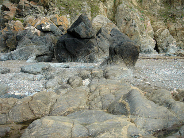 Dans ces rochers qui émergent du sable de l’estran, les replis de la foliation témoignent d’un comportement ductile de la roche (pression et/ou température élevée). Peu après sa mise en place, autour de 600 Ma, le pluton de granodiorite a subi de fortes contraintes tectoniques au cours d'une première phase compressive cadomienne contemporaine de la solidification du magma ; ainsi la granodiorite a acquis une foliation, ce qui lui confère localement les caractéristiques d’un gneiss, d’où son autre appellation « granodiorite foliée ».