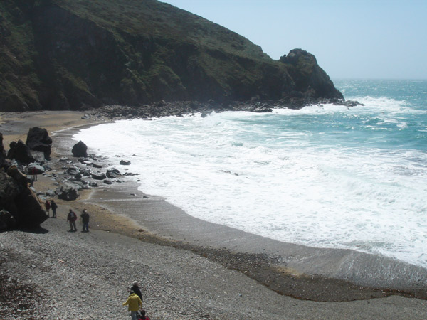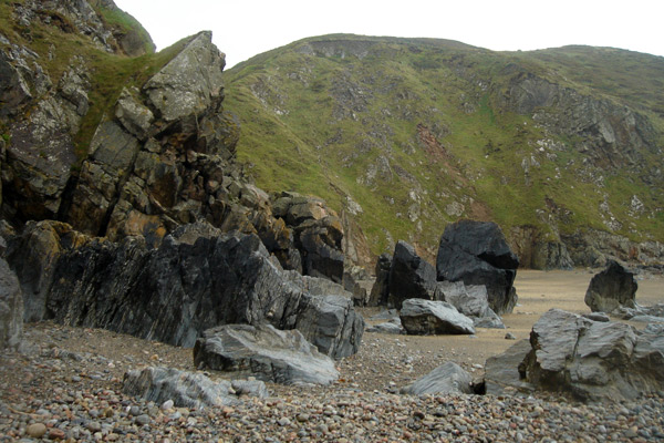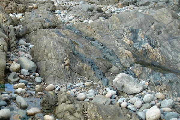 La granodiorite de Thiébot est traversée par des filons de dolérite gris bleuté, mis en place au cours de l’orogenèse varisque. Ces filons s’observent dans les rochers de l’estran et dans la paroi rocheuse du fond de l’anse. |