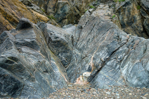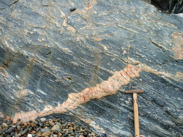 Les lits gris et blancs de la granodiorite de Thiébot sont recoupés par un filon aplitique décimètrique, de couleur rose.