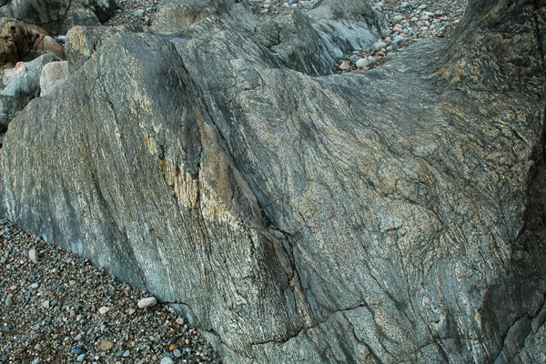 Granodiorite de Thiébot gneissifiée dans les rochers du haut estran et dans la paroi rocheuse du fond de l’anse du Cul-Rond.