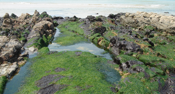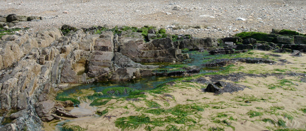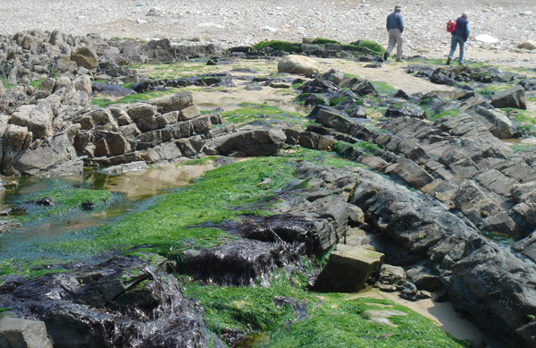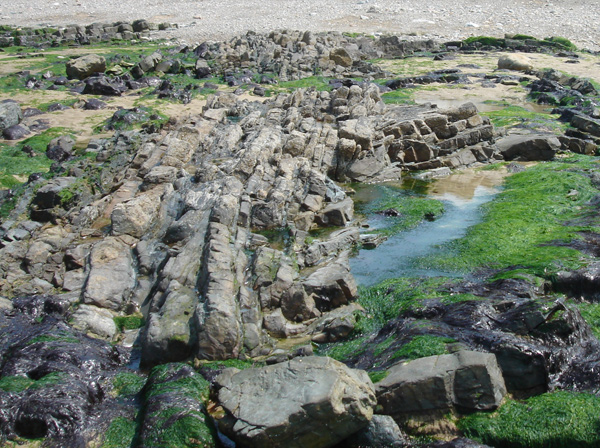 On peut suivre les bancs subverticaux sur l’estran rocheux ; ceux-ci ont une direction perpendiculaire à la ligne de rivage.