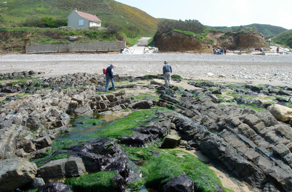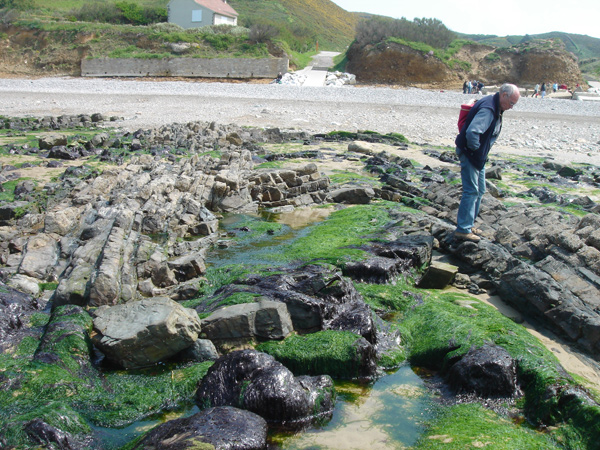 Le repli anticlinal se poursuit sur l’estran rocheux jusqu’à la mer (basse). |