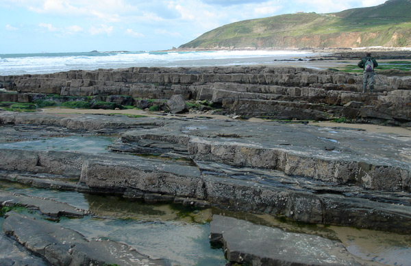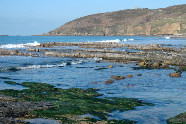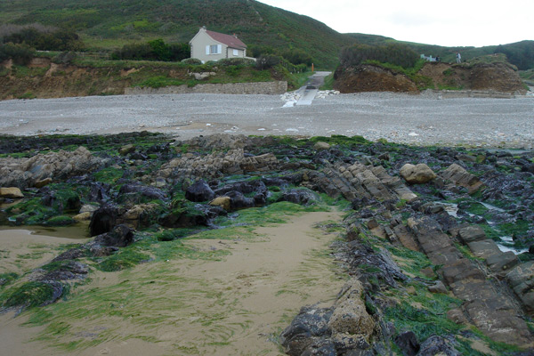 En face de l’accès à la baie, les grès siluriens du premier plan plongent vers le sud ; en arrière plan, des surfaces de bancs (en partie recouvertes d’algues) plongent vers le nord. Le changement de pendage révèle l’existence d’un repli synclinal dans les grès siluriens. L’axe du repli est approximativement perpendiculaire à la ligne de rivage.