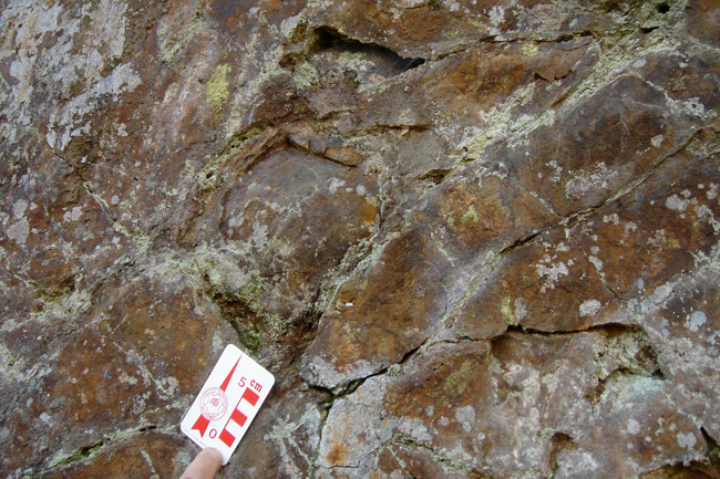 Les formes polyédriques arrondies, de couleur ocre et à bordure claire, correspondent à des coussins de basalte (pillows) empilés et moulés les uns sur les autres. Le débit en coussins indique que la coulée de lave a été émise sous l’eau.