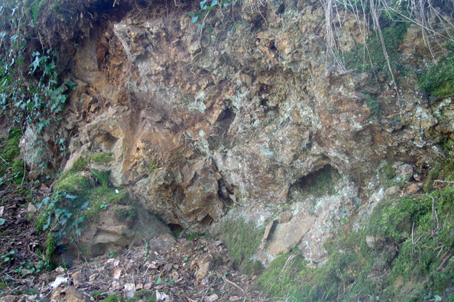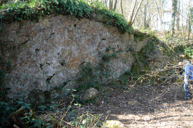 Le front de taille présentant les pillows se trouve au fond d’une ancienne carrière creusée dans la crête boisée parallèle à la route D303 et qui supporte le château de Vassy.