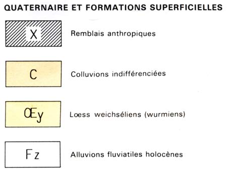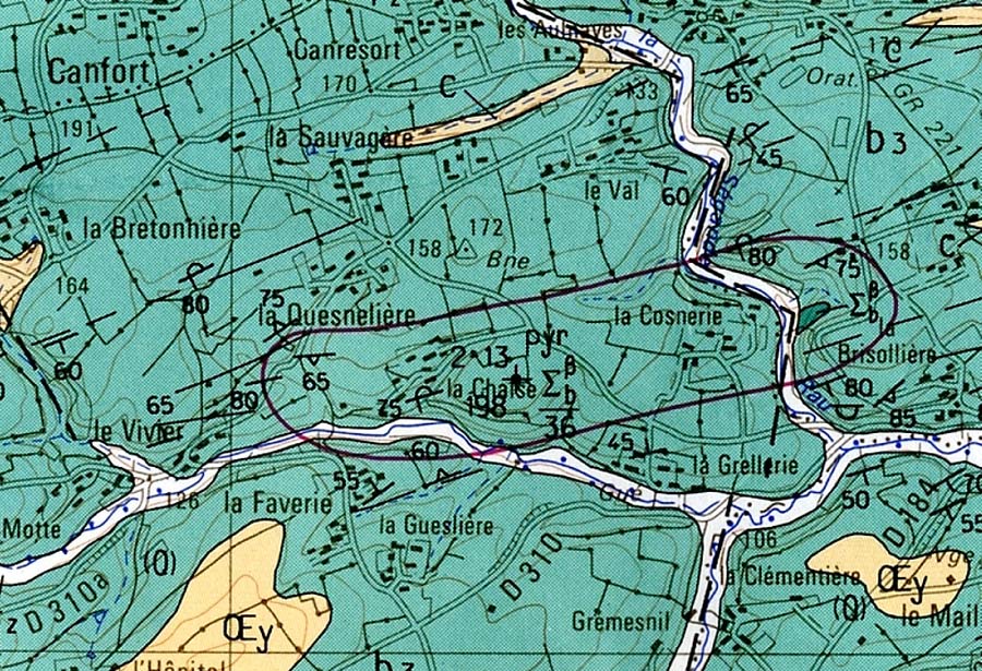 Extrait de la carte géologique de France à 1/50 000, feuille Condé-sur-Noireau (175) établie par F. Doré, L. Dupret, F. Dusmesnil, J. Pellerin et coll. (1993). Orléans : BRGM. |