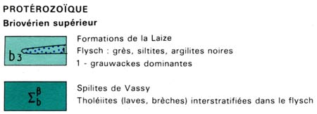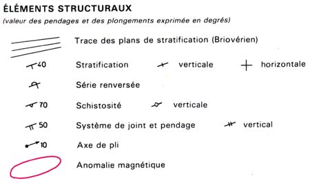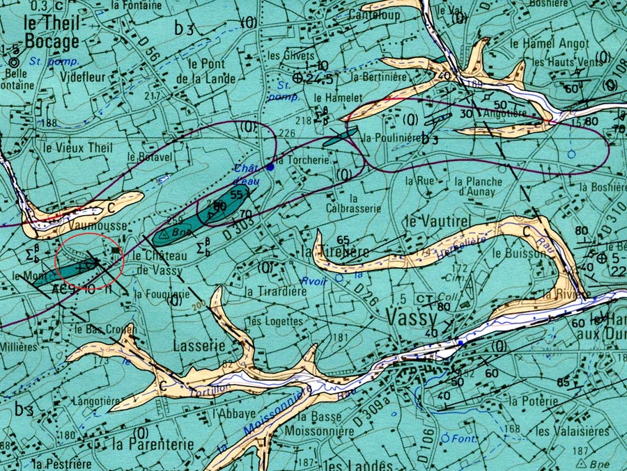 Les anomalies magnétiques positives situées au N et NW de Vassy sont liées à la présence, à l’affleurement et en profondeur, des spilites qui sont des roches riches en fer. Un forage (1981) implanté sur une de ces anomalies a recoupé une coulée basaltique à débit en coussins à 142m de profondeur. L’épaisseur des spilites a pu être estimée à 130m (Bardin, 1981).