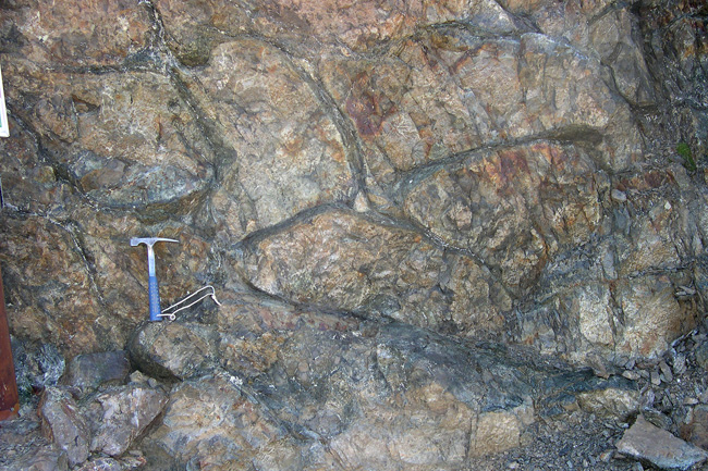 Chaque coussin basaltique est entouré d’un mince cortex qui représente l’enveloppe figée formée lorsque la lave entre en contact avec l’eau. Ce cortex s’altère facilement à l’affleurement ; il forme alors une bordure desquamante, à écailles concentriques.