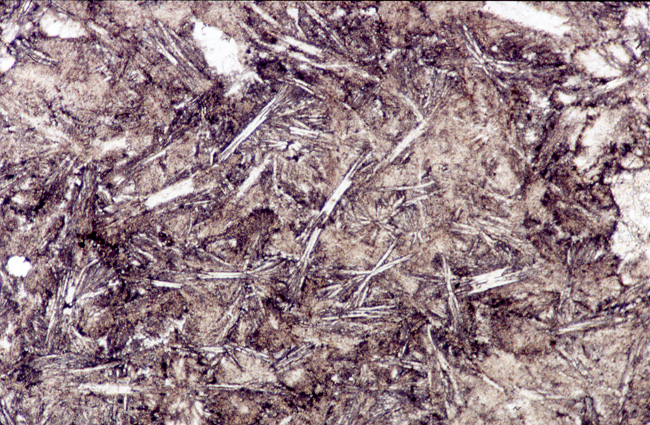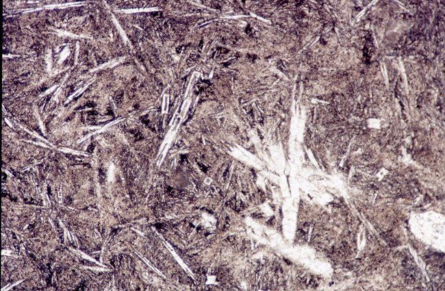 La lame mince a été réalisée dans la partie centrale d’un coussin ; elle révèle une structure microlithique, caractérisée par la présence de microlithes de feldspath (albite), cristaux clairs en baguettes, dispersés dans une pâte. Sans orientation privilégiée, les microlithes forment un réseau plus ou moins lâche (structure intersertale).