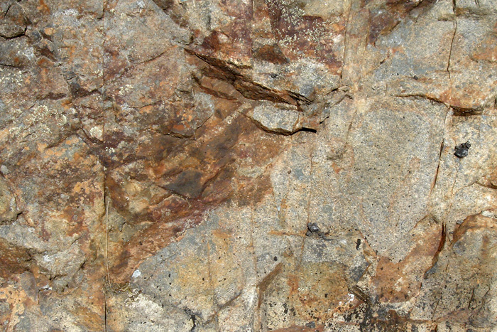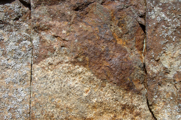 Le contraste de couleur souligne le contact : le matériel granitique est clair alors que les cornéennes sont plus sombres teintées de rouille. Le contact peut être très net et régulier ou bien diffus et irrégulier.