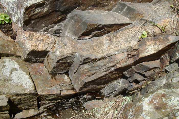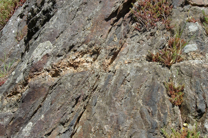 Epais d’une dizaine de centimètres, ce filon granitique (beige moucheté) suit approximativement la stratification des cornéennes (sombres, un peu mauves et à patine rouille).