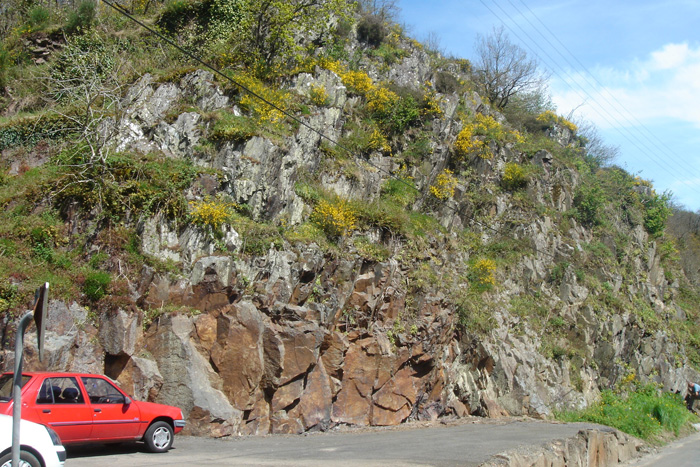 Lors de la mise en place du batholithe de granodiorite, le matériel granitique a pénétré plus ou moins profondément dans l’encaissant en formant des filons qui ont suivi soit la stratification soit la fracturation des sédiments briovériens transformés en cornéennes. |