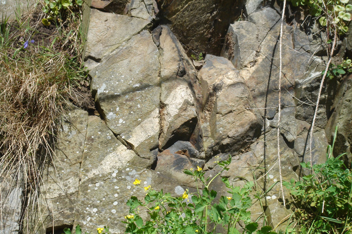 Attention, les taches noires visibles en bas à droite correspondent à des projections de goudron sur la base de l’affleurement.