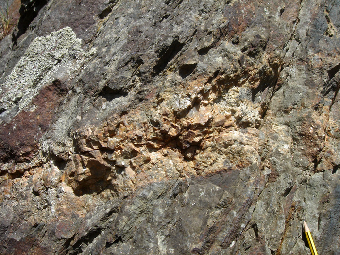 Un filon de pegmatite, à gros cristaux, recoupe les cornéennes.